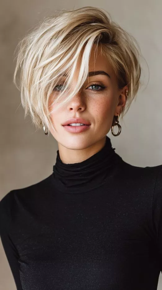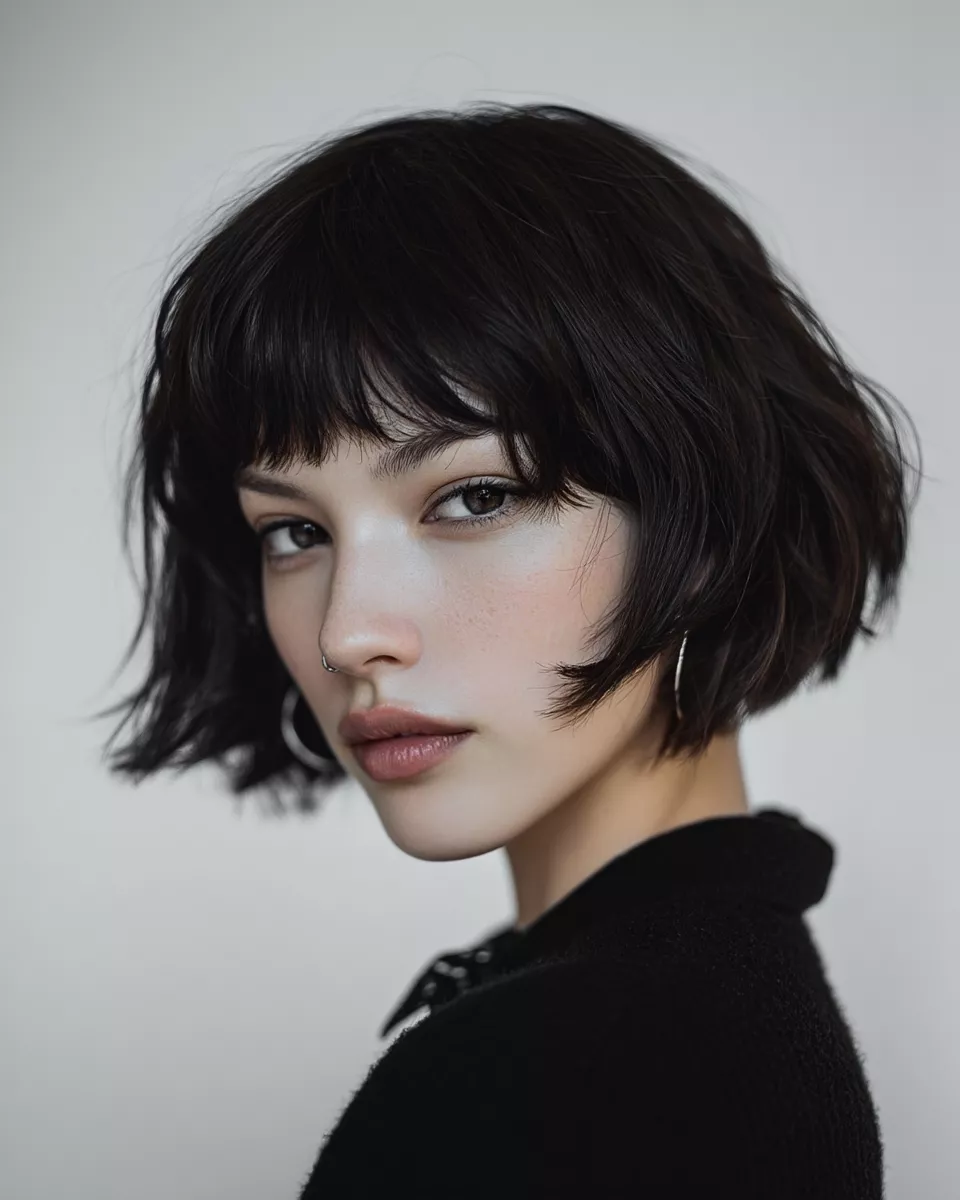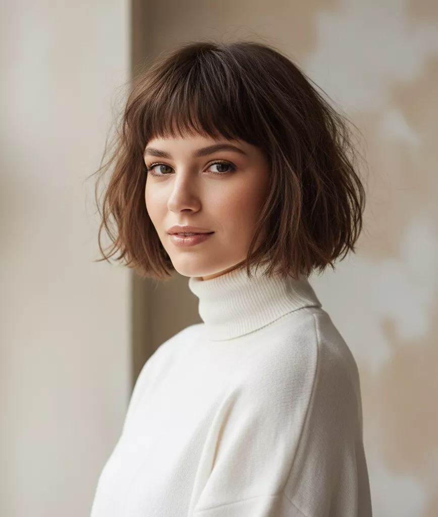 Главный хит осени 2025 – новая версия классического боба. В этом году он стал текстурированным, с рваными краями и легкой небрежностью. Особенность тренда – ультракороткая челка длиной 2-3 см, которая открывает лоб и придает образу дерзости. Идеально подходит для овальных и треугольных лиц, визуально вытягивает круглое лицо.