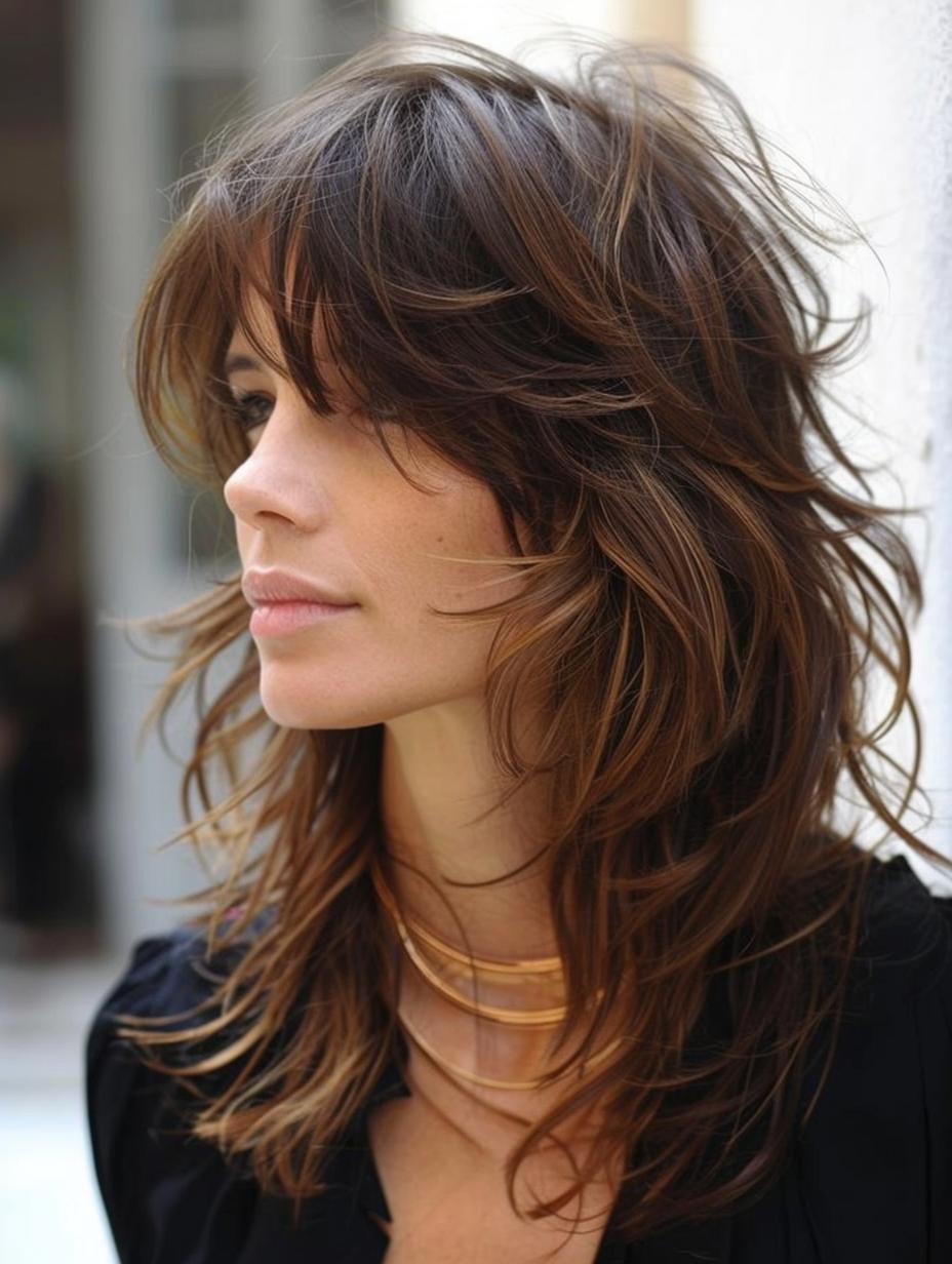 Легендарная стрижка 70-х возвращается в обновленном виде. Современный шэг характеризуется хаотичными слоями от макушки, создающими объем и движение. Обязательный элемент – челка-шторка. Идеальная длина для шег 2025 – до плеч или чуть ниже. Стрижка подходит для вьющихся и прямых волос, корректирует квадратную форму лица.